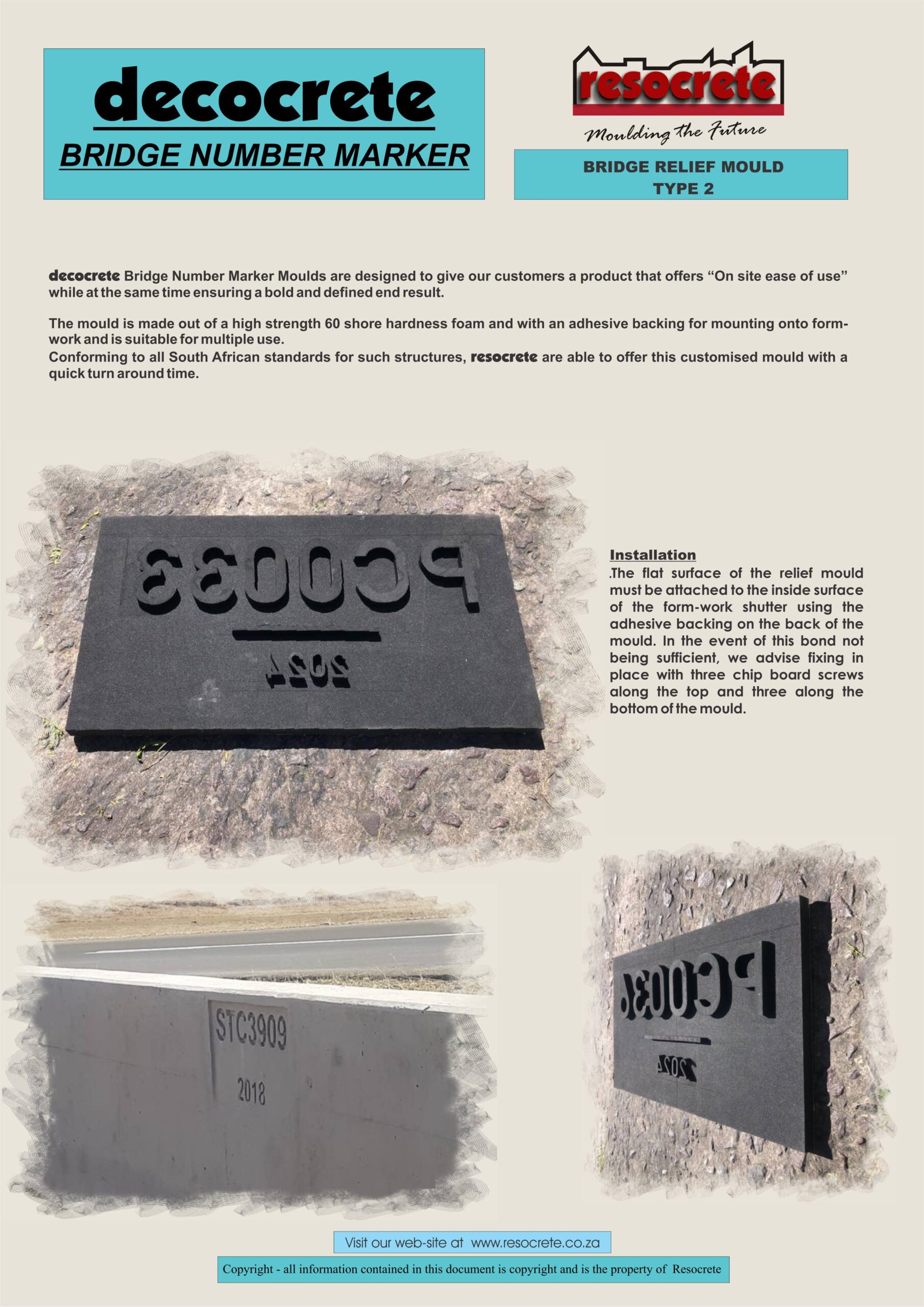 Relief Mould Type 2 March 22, 2024August 29, 2019 by Resocrete Bridge number marker relief mould bridge mold bridge number marker